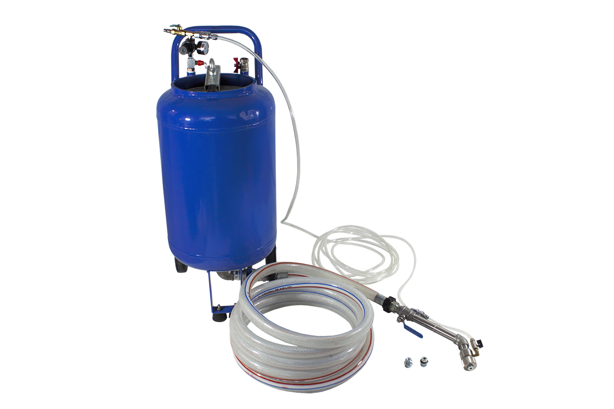 - Подсоединяют шланги подачи материала от бака к распылителю, шланг подачи сжатого воздуха от бака к распылителю, питающий шланг от компрессора к редуктору бака.